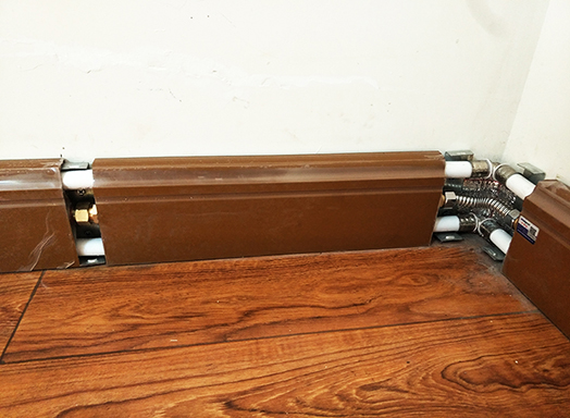 在已装修房屋安装踢脚线暖气片时,需要过入户门或阳台移门处时,可以这样竖着安装踢脚线暖气片,供暖管道从踢脚线暖气片布置,避免墙面看到管子。