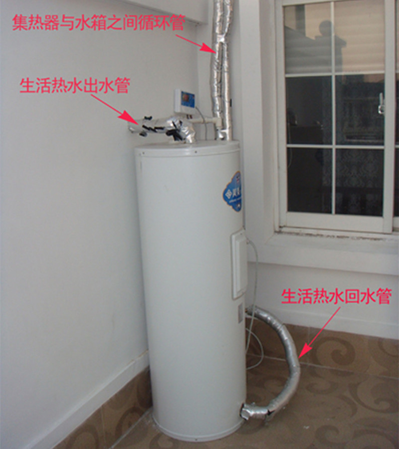 非承压式太阳能水箱的出水管(下水管),与缓冲保温水箱入水口连接,从缓冲水箱出水口接出管道,与自控中心右下水口连接,在这之前不要有用水点自控中心左下水口与家里热水主管相连,然后依次经过各个用水点,直到最后一个用水点,热水管继续向前,利用三通与太阳能的下水管相连,并在三通与最后一个用水点之间以及向太阳能水箱一边分别安装上单向阀,让水流向自控中心。