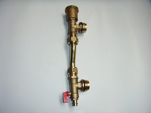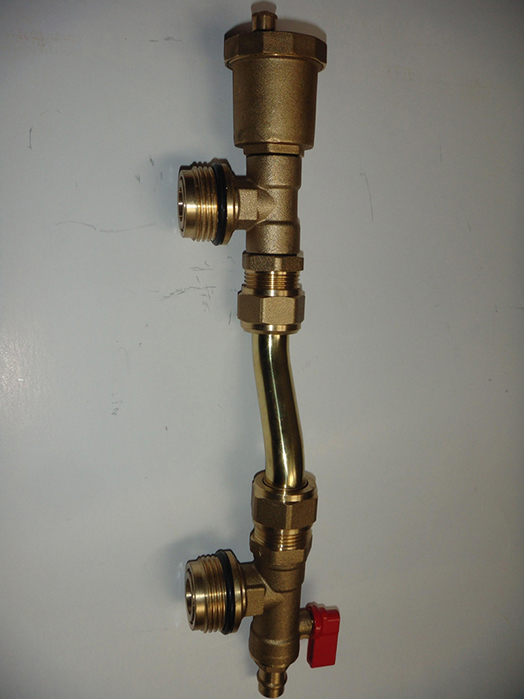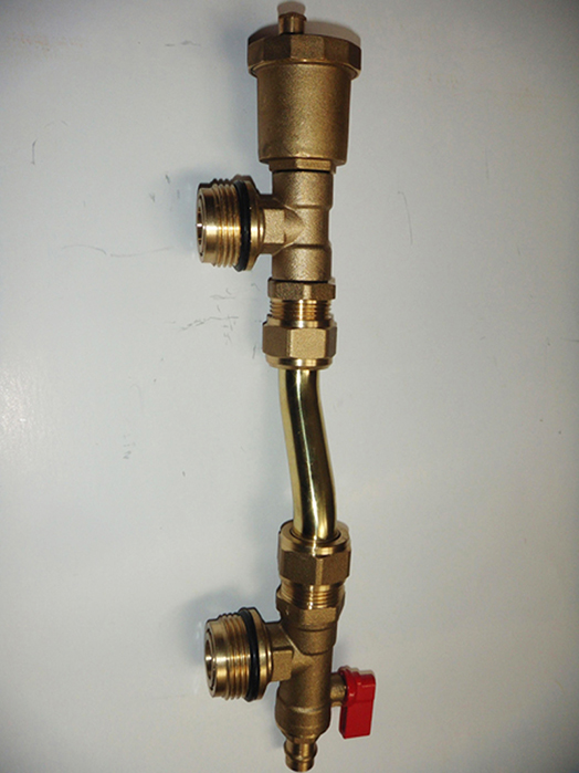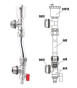 本产品是安装于分水器尾端的配套产品,具有自动调节供、回水压差、自动排气和排水排污的功能。当供回水管的压差达到0.25-0.3Mpa时,旁通阀自动打开,平衡供回水管的压力,从而保护燃气壁挂炉、采暖系统等安全,防止被高压破坏;当采暖系统有空气时,旁通阀顶端的排气阀自动打开,将空气排出采暖系统,从而保证采暖系统工作正常;当需要清理系统时,手动打开排水阀即可,方便快捷。