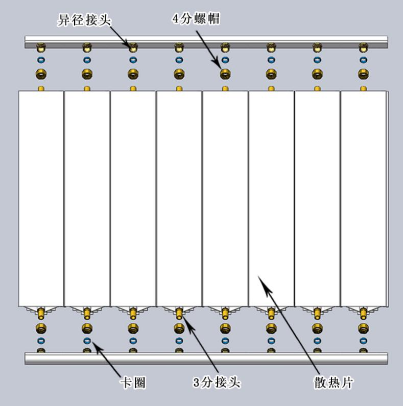 第二步,装配在一起。在散热片上下各放一根主管,使主管上的支管异径接头与散热片两头的3分接头一一对应,将异径接头上螺帽和卡圈取下来,依次套在3分接头螺杆上,再将螺杆插入异径接头的内腔里,并插到底;