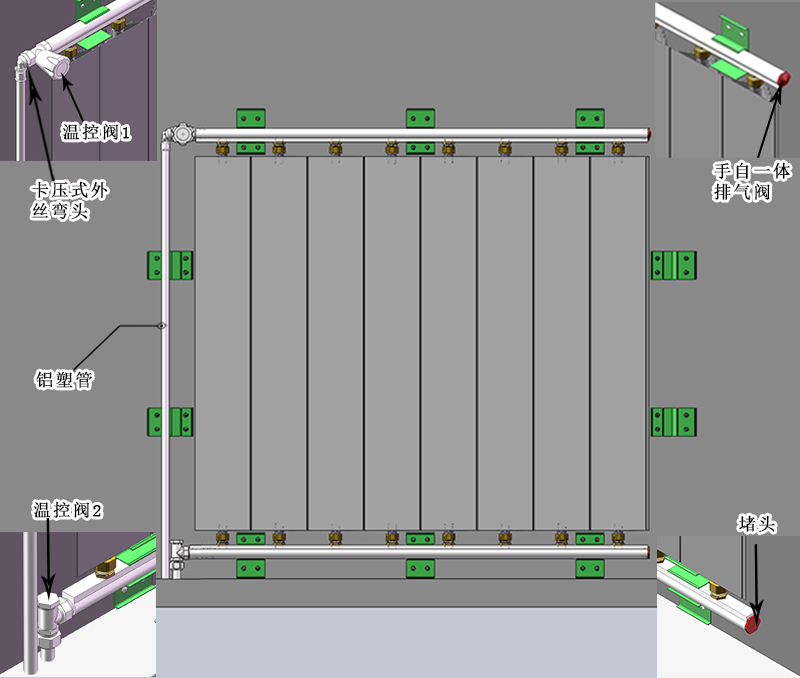 三、与系统管道的对接及温控阀、排气阀、堵头安装