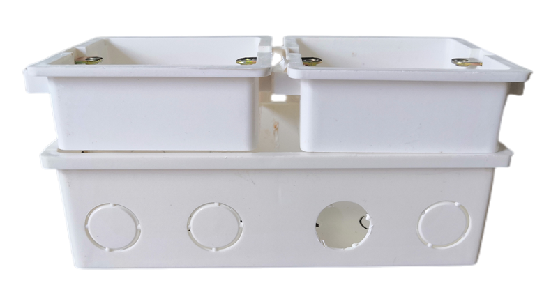预埋的是双联86暗盒,并加增高圈。预埋暗盒的墙面开槽的尺寸约为:长度176mm、深度80mm、高度80mm;然后双联86暗盒放入底部,外面再放上暗盒增高圈,然后用水泥固定住;