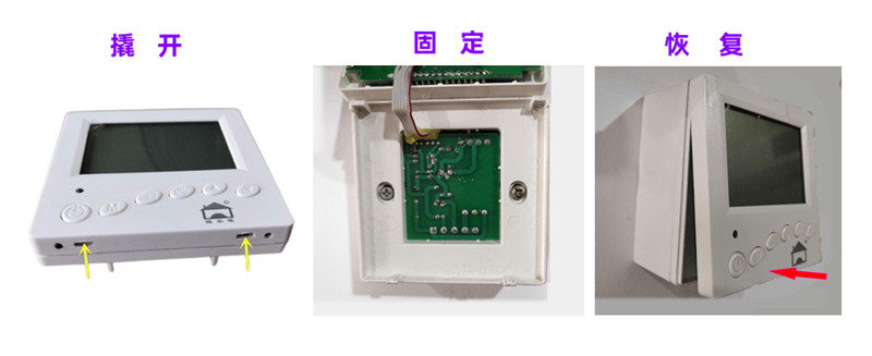 电源线连接好后,用一字螺丝刀插入智能控制器下面凹槽内,向里轻推向上一橇将控制面板和电源板分开,然后用配备的螺丝将电源板安装在其中一个86暗盒内,再将面板上面先挂在电源板上部,然后向下稍用力一推,将下面固定在电源板上,控制器就安装好了。