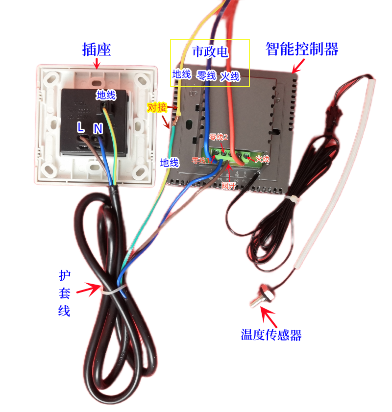 护套线的红色线一头与插座的L端子连接,另一头与智能控制器的阀开端子连接;护套线的蓝色线一头与插座的N端子连接,另一头与智能控制器的零线端子连接;护套线的黄色线一头与插座的地线端子连接,另一头与86盒内预留的地线连接。