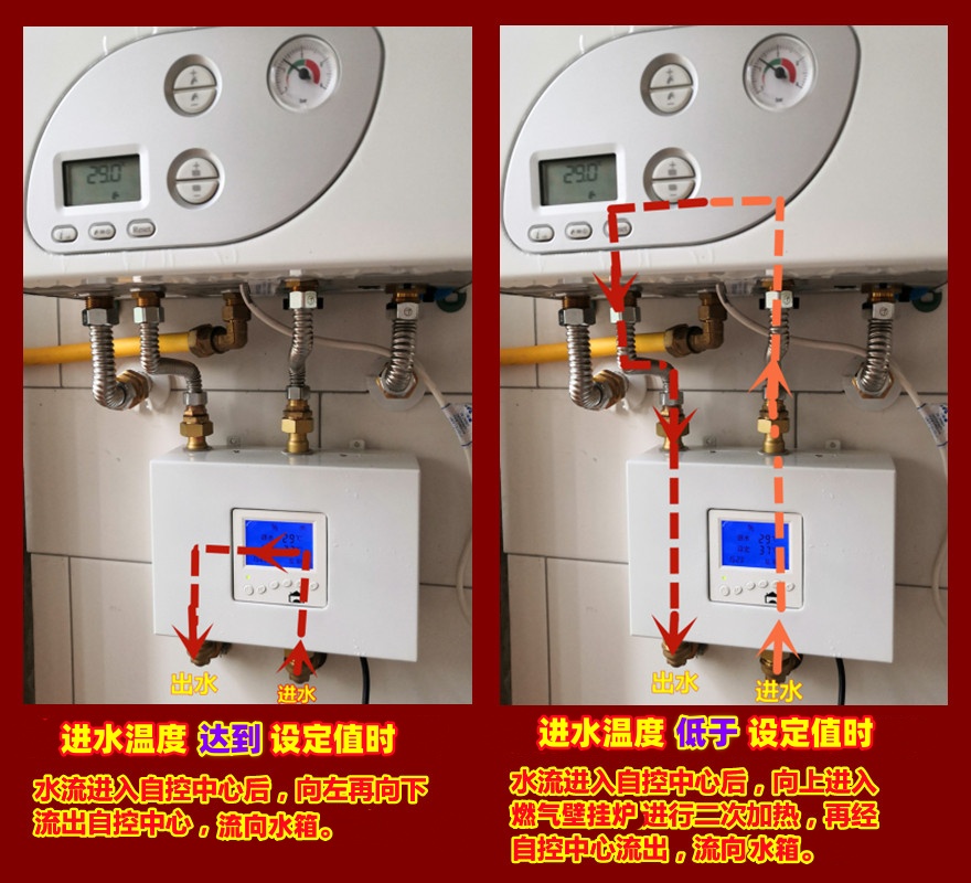 当从自控中心右下口进入的水,经检测如果能达到其设定温度,就从内部的旁通管向左流动,从左下口直接流出,进入水箱;如果低于其设定温度2°C,水流就转向,向上从右上口流入燃气壁挂炉二次加热,再从壁挂炉热水口流出,从左上口流入自控中心,再从左下口流进水箱。