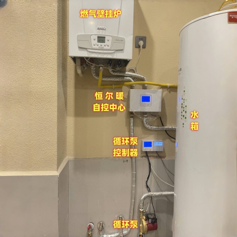 (燃气壁挂炉、水箱、恒尔暖自控中心、循环泵及其智能控制器安装实景)