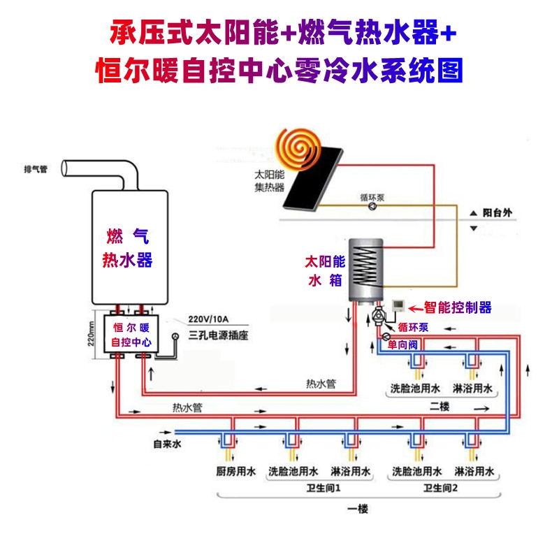 在现代家庭中,安装两台热水器的现象越来越普遍。一方面,随着生活水平的提高,人们对热水的需求更加多样化。另一方面,不同类型的热水器在不同季节和使用场景下各有优势。例如,燃气热水器在任何季节都可以使用,而太阳能热水器在阳光充足的夏天十分的好,它利用天然能源,十分的节能环保,如果太阳能和燃气热水器组合供热水是十分完美的方案。然而,传统的手动切换水阀方式存在诸多缺陷。手动切换不仅麻烦,尤其是对于家里只有老人或儿童的家庭来说,操作起来具有一定难度。而且在太阳能水温低不能直接洗浴时,不能流经燃气热水器二次加热,而是用自来水进燃气热水器加热,这种方式不节能。此外,想做成每个水龙头一开就有热水的零冷水系统也无法实现。正是在这样的背景下,恒尔暖自控中心应运而生。它的出现解决了传统手动切换水阀的繁琐问题,实现了太阳能和燃气热水器的智能控制,无需手动切换两边水阀,为家庭热水供应带来了极大的便利。同时,恒尔暖自控中心还可以利用太阳能的水箱做成零冷水系统,使每个水龙头即开即有热水,不用等待,也不浪费冷水。可以说,恒尔暖自控中心的诞生满足了现代家庭对舒适、节能、方便的热水供应的需求。