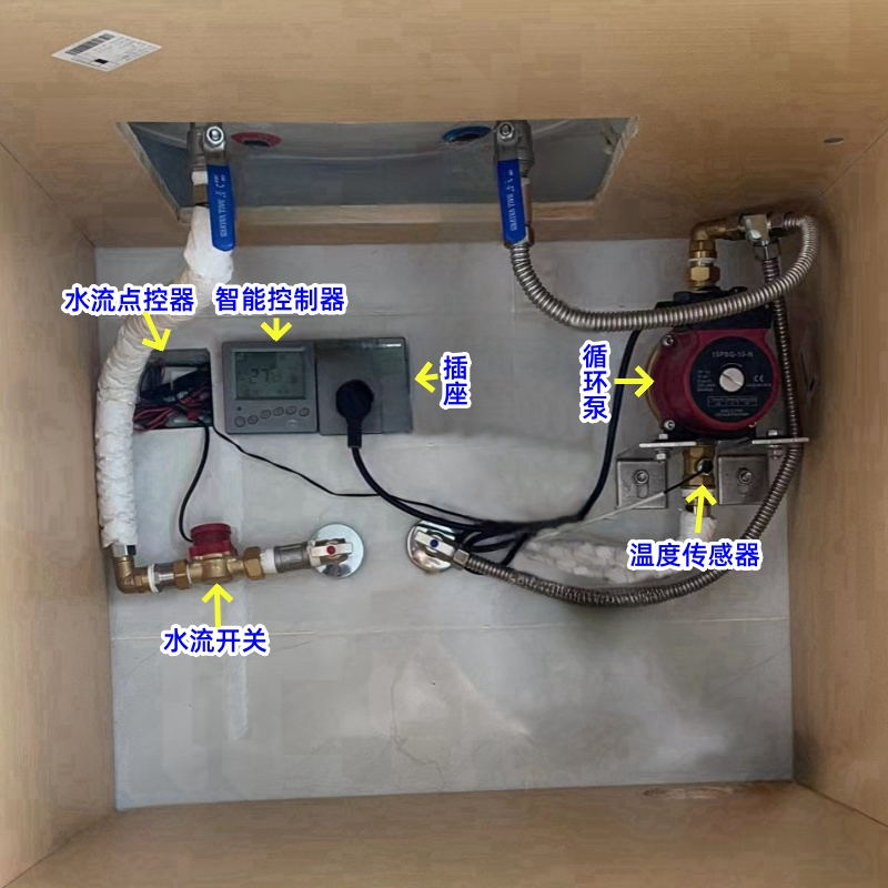 循环泵的控制:循环泵建议带定时定温功能智能控制功能,否则要手动开关机。建议配置恒尔暖循环泵周编程智能控制器套件,具有温度控制、 5+2 周编程智能定时控制和水流点控的功能,节能方便;可以将循环泵每天每个开机时间点设置比自控中心早 2分钟左右,减少燃气热水器的开停次数,也节省燃气费;确保每个用水点即开即有热水,无需等待,也不会浪费冷水。
