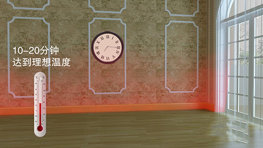 从房间四周向中间辐射供暖,即开即热,10-20分钟,室内达到理想温度。是上班族家庭、学校和办公楼等需要间歇式供暖场地的理想选择。