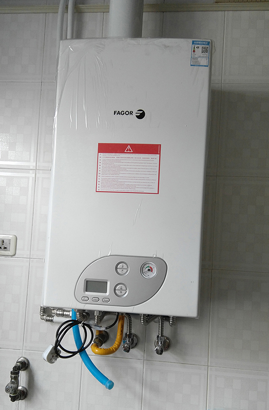 第十一步,安装锅炉。师傅们把原来燃气热水器拆除安装上一台西班牙的品牌FAGOR壁挂炉,并且将锅炉与系统连接好。