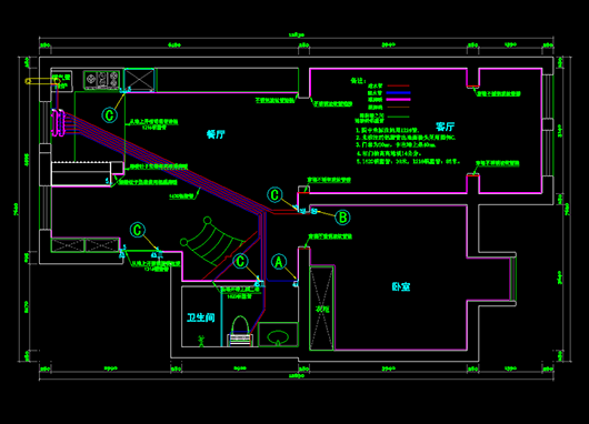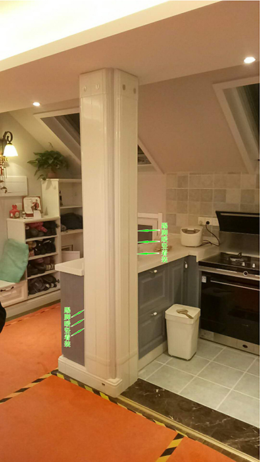 图片说明:因为厨房为敞开式,客餐厅和厨房能安装的墙面少,因此在厨房边柱子上竖着安装4根双水道踢脚暖,相当于9.6m,补充的散热量为2227w,足可以满足20平米左右的空间供暖需求。踢脚暖与装修有机结合,丝毫看不出供暖设备。