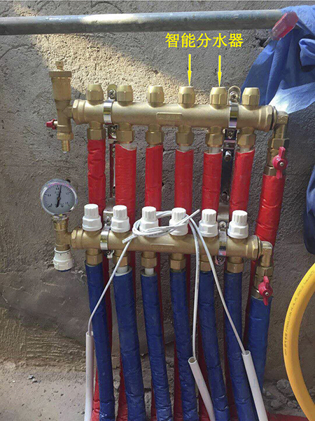 图片说明:采用锻造一体智能分水器,分水器主管和支管一体锻造成型,减少渗漏水风险,从分水器到每个供暖区域预埋温控器连接线,以便后期安装温控器。