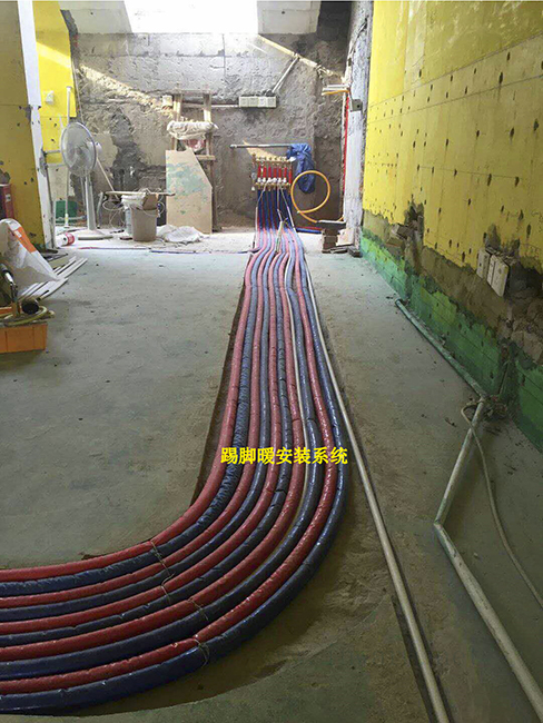 图片说明:采用燃气壁挂炉作为踢脚暖的热源,从燃气壁挂炉到分水器位置预埋供暖主管,并做上保温。