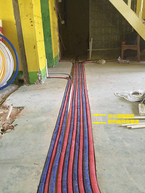图片说明:采暖系统采用分水器、双交联对接焊铝塑复合管和PE保温管进行施工,每个回路一进一回2根管道。