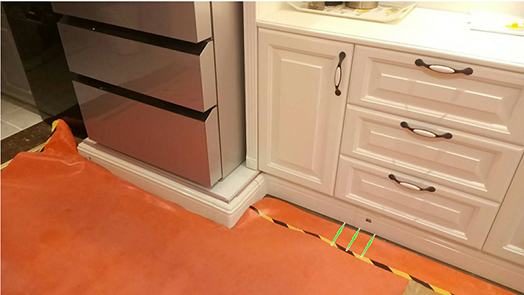 新房毛坯房安装踢脚线暖气片遇到柜子时,预先定制柜子时将柜门抬高13cm,将踢脚线暖气片之间安装在柜子前面。