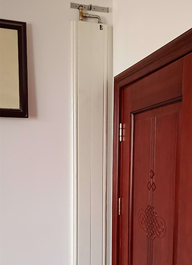 在已装修房屋安装踢脚线暖气片时,需要过入户门或阳台移门处时,可以这样竖着安装踢脚线暖气片,供暖管道从踢脚线暖气片布置,避免墙面看到管子。