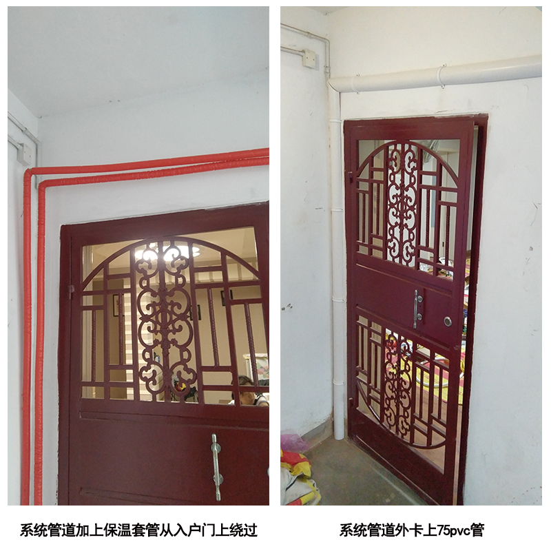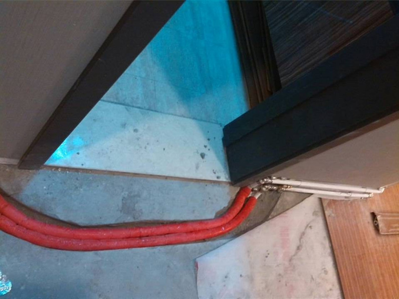 (踢脚暖系统管道打孔到室外从门上绕道室内)