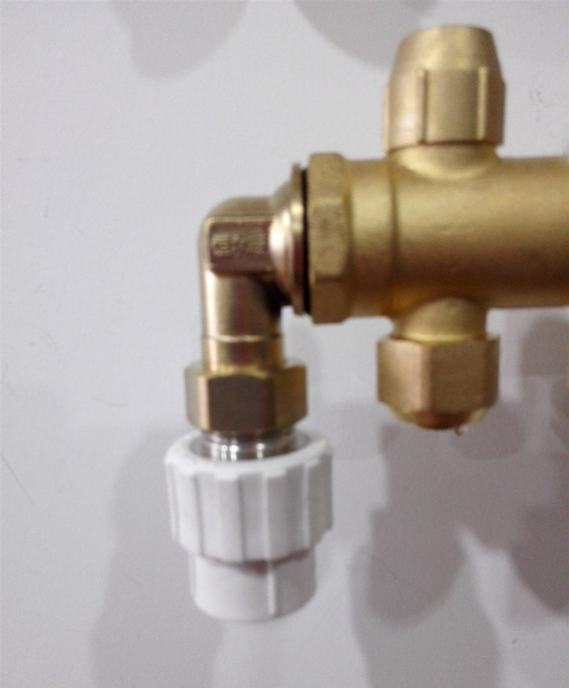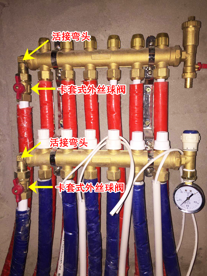 活接弯头+PPR外丝直接。用于PPR、PPR稳态管等供暖主管与分水器之间的连接,供暖主管可以是25或32等规格的PPR管等。在供暖主管与分水器之前不需要安装阀门,用这样方法安装。如下图: