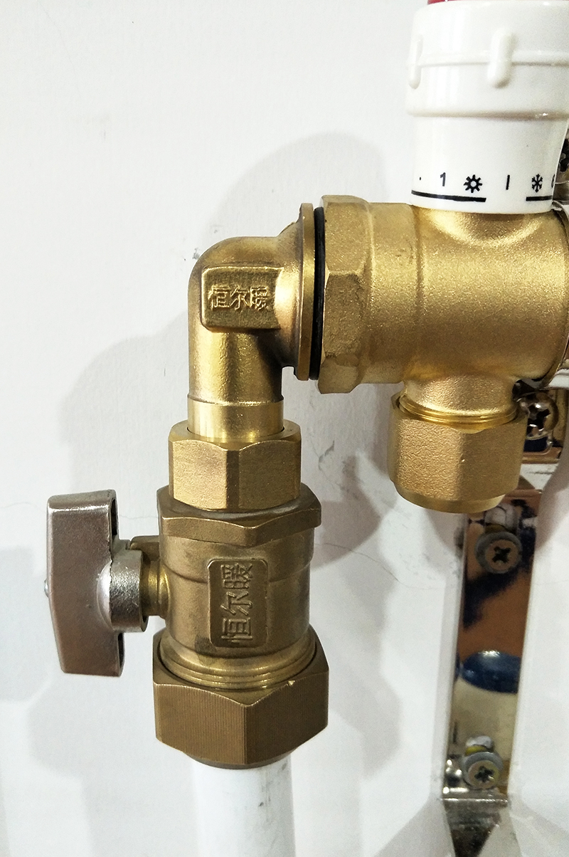 我们知道地暖和用章鱼式系统的暖气片或踢脚暖都要用到分水器作为供暖水的分流和集回控制中心,为了美观,分水器一般都放在卫生间洗脸池或厨房的橱柜下,由于这些地方的空间都很有限,因此分水器和供暖主管尽量少占地方最好,有的安装师傅根本不为顾客考虑这些问题,在供暖主管与分水器连接处用直阀,占用很大空间,见下图。