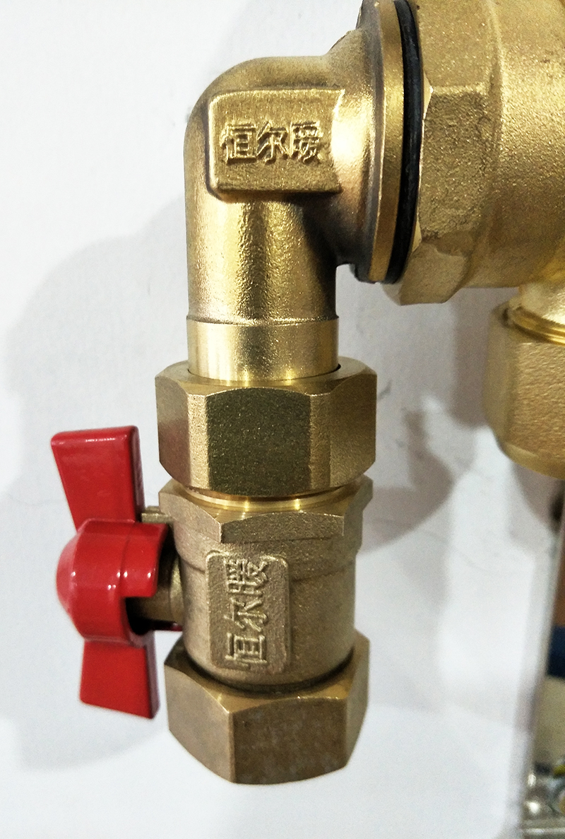 (恒尔暖活接角阀组件活接弯头小巧,即使分水器安装好也可以拆卸)