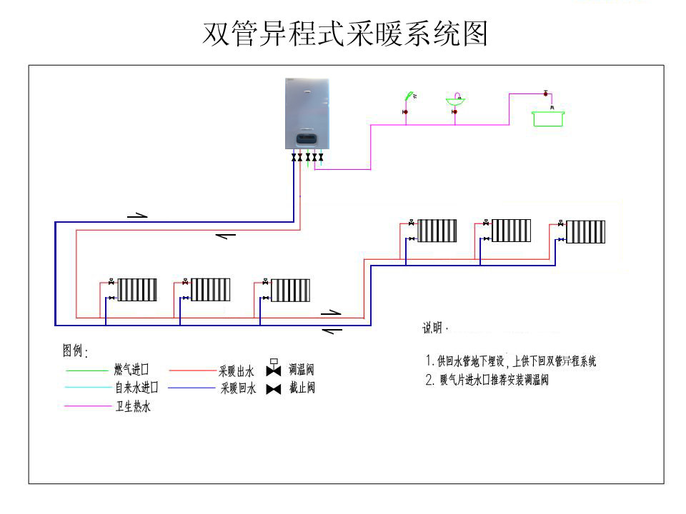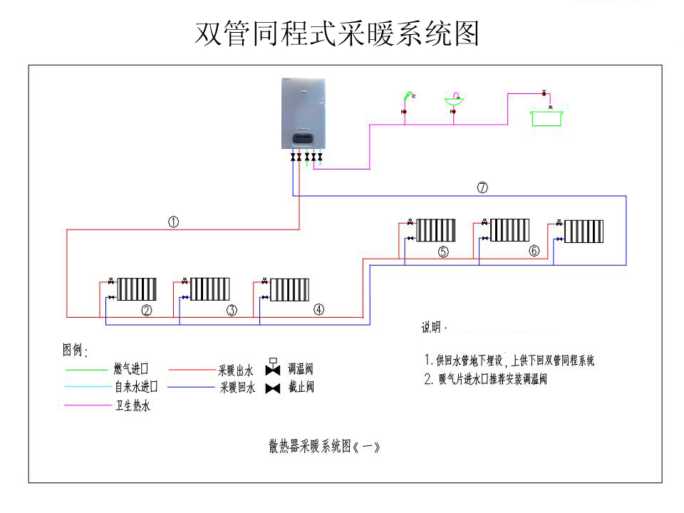 从热源出来2根供暖主管道并排通到每个房间,到达每个房间的暖气片或踢脚暖处用三通接出2根支管分别与暖气片或踢脚暖的进回水端口相连。根据供暖主管里的水流方面,双管并联系统又分为:双管同程式系统和双管异程式系统,下面分别介绍。