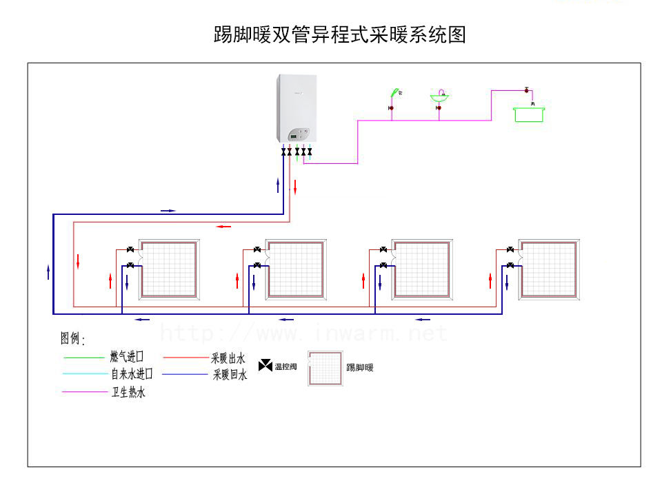 从以上示意图可以看出,供暖进水主管和回水主管并排前行,到每个房间时分别通过三通接出支管与这个房间的暖气片或踢脚暖的进回水口相连,越靠热源的暖气片或踢脚暖的进水管(主管加支管)加上回水管(主管加支管)的合计长度越短,系统阻力越小,越远离热源的越长,系统阻力越大,因此这种采暖系统不好调节水力平衡,一般只适用于面积较小的房型,面积较大的房型最好不要采用这种异程式采暖系统,以免调节不好。