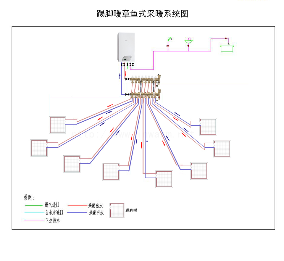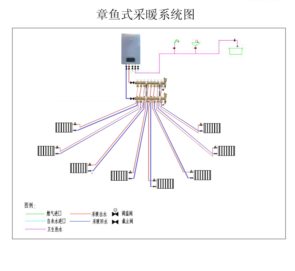 从热源接出2根供暖主管,通到集分水器,然后从集分水器到每个房间的暖气片或踢脚暖再布置2根进回水支管,支管从集分水器处向四周分散,看起来像章鱼的触角向四周延伸,因此供暖行业形象的叫这种采暖系统为章鱼式采暖系统,这种采暖系统只适合毛坯房或地上可以开槽的房子安装。