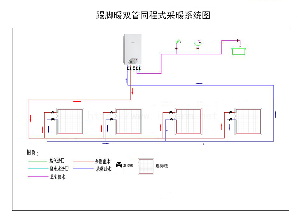从以上示意图上可以看出,供暖进水主管到第一个房间暖气片或踢脚暖时,通过三通接出支管与其进水口相连,然后开始有回水管,到第二个房间时,进回水主管通过三通分别接出支管与这个房间的暖气片或踢脚暖进回水口相连,直到最后一个房间,进水管截止,回水主管继续前行回到热源(燃气壁挂炉或集中供暖的立管)。我们可以看出,这种采暖系统,供暖主管里的水流方向相同,每个房间的暖气片或踢脚暖的进水管加上回水管的合计长度差不多相等,阻力差不多,水力平衡好调节,每个房间的暖气片或踢脚暖都可以同时热,不容易出现有的房间热,有的房间不热的情况。
