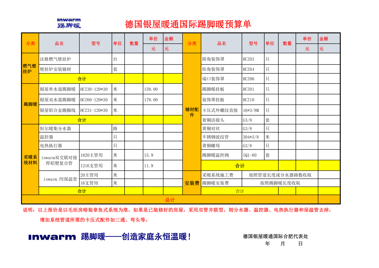 下面我们以银屋踢脚暖取暖器安装的报价单为例来进行介绍,报价单如下图: