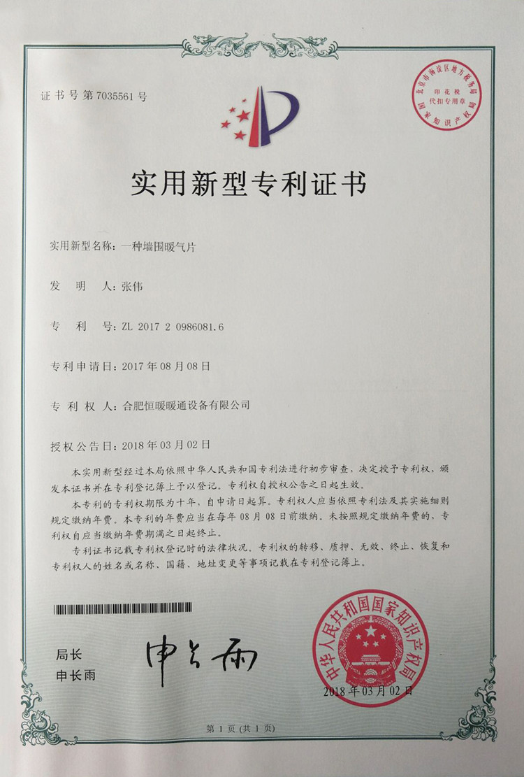 银屋暖通国际的研发团队经过多年的潜心研究,在银屋薄型墙暖的散热片结构、安装方式、连接配件等方面先后获得中华人民共和国国家知识产权局颁发的8项专利证书。到目前位置,在全球范围内还没有发现同类产品。
