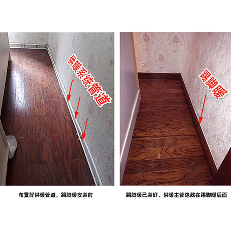 踢脚暖明装的时候,供暖系统管道可以从后面布置,这样安装好了以后,墙面上就看不见管道,并不会破坏原来的装修装饰。这一点对于房屋已经装修的用户来说,是非常好的选择,在房屋明装供暖方面,是非常理想的方式;