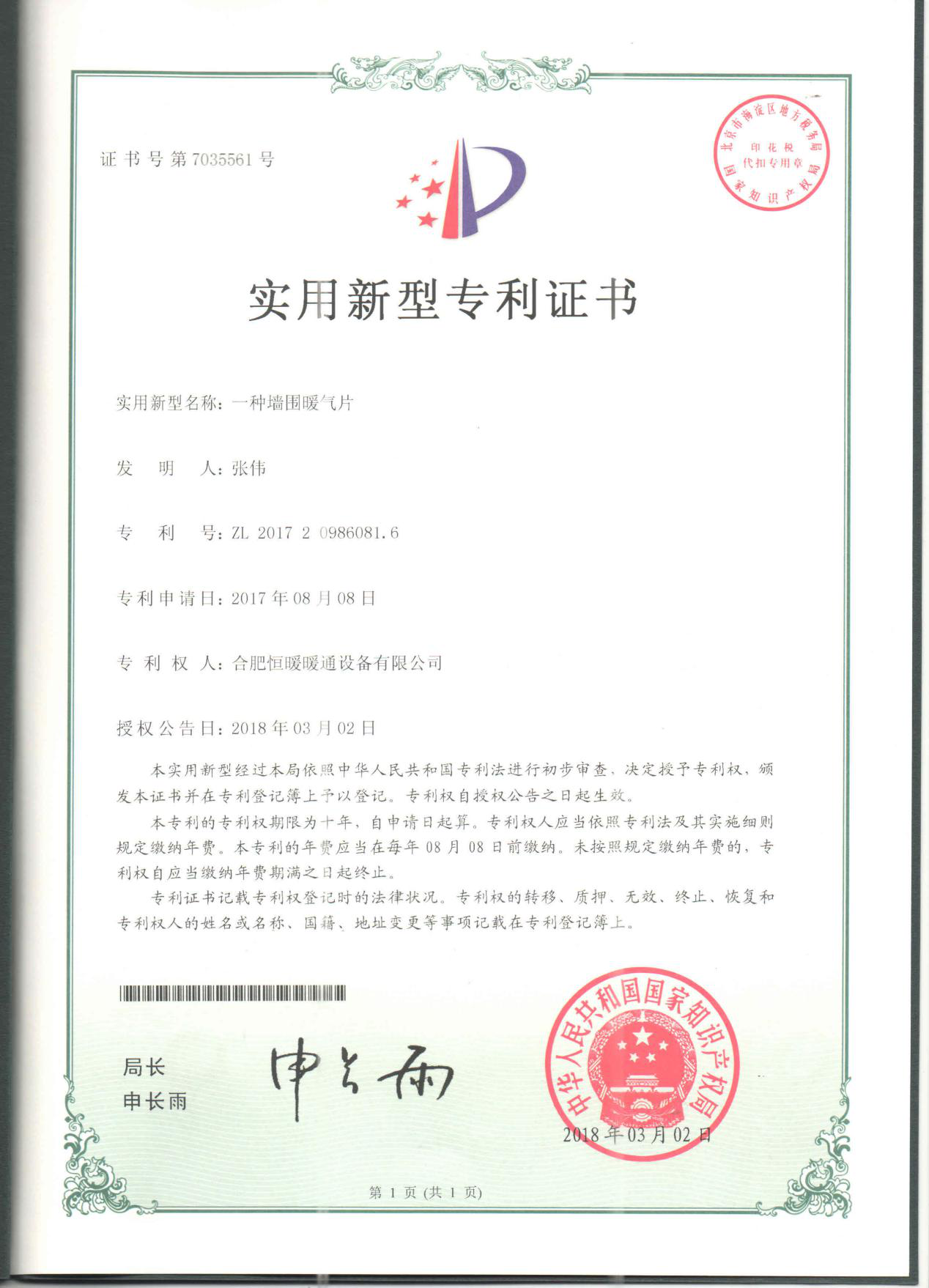 (银屋墙围暖气片专利证书)