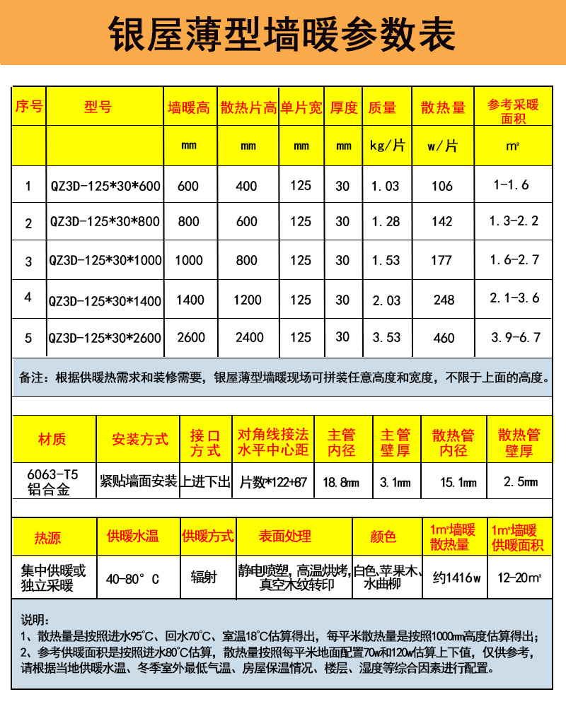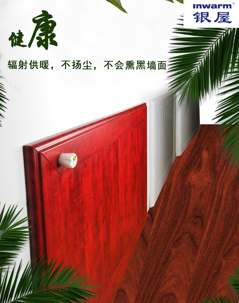 银屋装饰护墙板暖气片,厚度只有3cm,只有传统暖气片的1/4-1/5的厚度,紧贴墙面安装,美观不占据室内空间;隐形供暖,外观看起来就是墙面或护墙装饰板,看不出供暖设施;无尖锐棱角,安全无隐患,是有小孩的家庭的理想选择;辐射供暖,不扬尘,不会熏墙墙面;安装方便,可以根据客户需求现场组装任意高度和宽度;即使安装好后也可以很方便增加片数,而且是无缝拼接。
