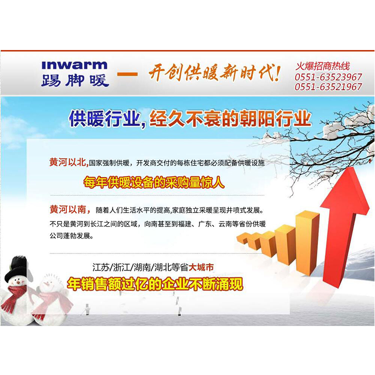 供暖行业,是经久不衰的朝阳行业。每年有1500亿的采购量,可以说是没有天花板的行业。黄河以北,国家强制供暖,房地产配套的供暖设备年采购额几百亿元以上;黄河以南,随着人们收入水平的提高,家庭独立采暖呈现井喷式发展,每年以40%左右的速度在增长,现在新房装修30%的业主都会考虑安装供暖,更有过去装修好的房子绝大部分没有安装供暖,随着人们消费水平的提高,这一块的明装供暖市场也是一块十分大的蛋糕。