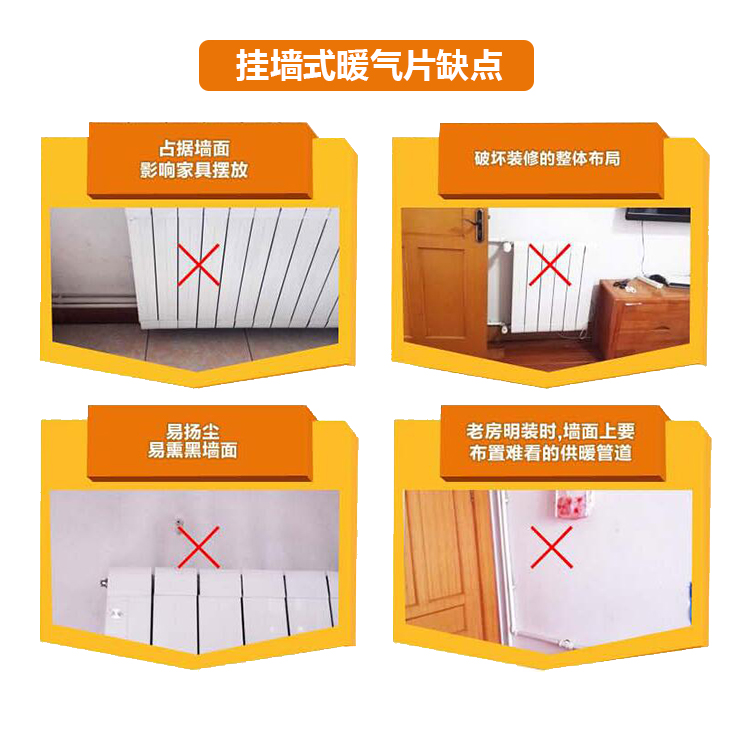 占据墙面,影响家具摆放;凸出墙面较多,占据室内空间,一般有尖锐棱角,容易碰伤儿童;外形不美观,影响装修的效果,破坏装修的整体布局;对流式供暖,易扬尘,容易熏黑墙面;已装修房屋后期安装时,墙面上要布置难看的供暖管道,破坏原来的装修装饰。