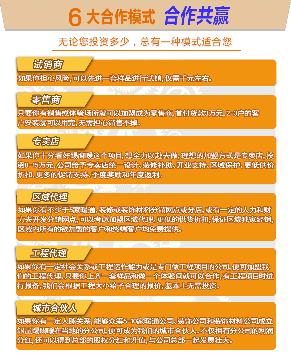 从只上样品的试销、到全力以赴的专卖、到区域独家经销的代理,到与总部荣辱与共的城市合伙人多种合作模式,只要你看好银屋踢脚暖采暖这个产品,无论投资多少,均可以成为我们的合作伙伴。如果你是一个短视频爱好者或直播能手,甚至你不用开店不用上样品不用囤货,你不用投资一分钱,只需要利用你的优势进行网络宣传,有人购买时,我们一件都代发,如果你是一个网店运营高手,可以加盟成为我们的京东或天猫授权旗舰店。