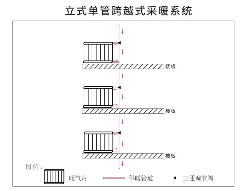 如下图三,又可以叫着上下单管跨越式,楼上楼下不同楼层同一个位置的房间安装的暖气片与一根主管分出的2根支管相连在一起。