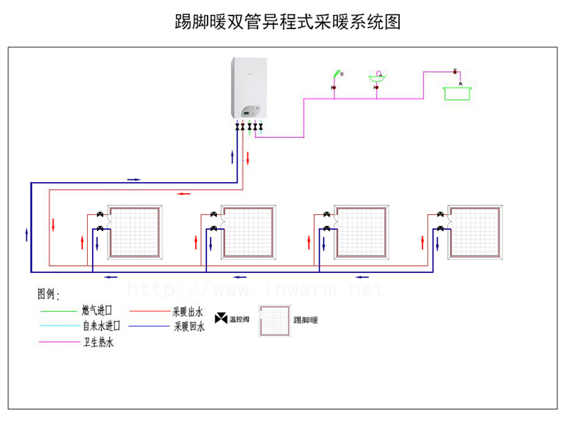 踢脚暖采暖系统和暖气片采暖系统有很多相同之处,但也有不同的地方,因此踢脚暖采暖系统单独以图示进行说明。