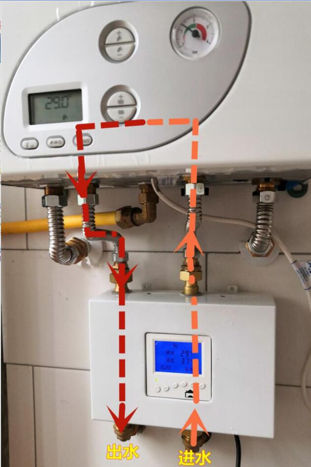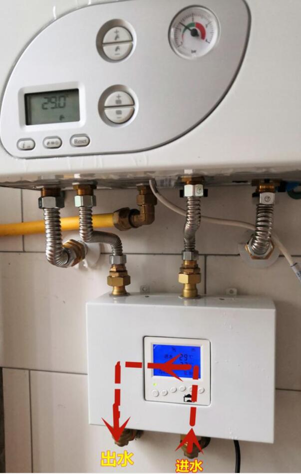 家里同时安装了太阳能热水器和燃气热水器,如何组合在一起供热水?又想每个水龙头即开即有热水不等待不浪费冷水能否实现?传统做法是在两边均安装水阀,用太阳能的出水时,关闭燃气热水器的水阀;在太阳能水温不够时,关闭太阳能水阀,开启燃气热水器的自来水进水阀,用自来水直接加热。这样操作不仅十分不便,而且也不节能。因为太阳能的出水虽然不能直接洗浴,但也高于自来水水温,如果用太阳能出水流经燃气热水器进行二次加热,不是要节能的多吗。这个问题被合肥恒暖设备有限公司发明的2种热水器配合供热水智能控制器——恒尔暖自控中心解决了。将这个自控中心安装在太阳能和燃气热水器之间,它的右下水口与太阳能的出水管直接连接,中间不要有用水点,左下水口与家里的热水主管连接,右上水口与燃气热水器的冷水入口连接,左上水口与燃气热水器的热水出口连接。在太阳能的出水温度能够达到自控中心的设置水温时,热水就从右下水口进入,从自控中心里的旁通管流向左边,从左下水口流出,直接流向用水点.