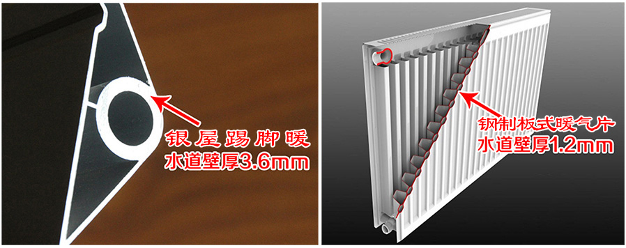 传统暖气片水道壁较薄,一般在 0.6-1.5mm 之间,且存在较多焊接点,容易被腐蚀导致漏水,使用寿命较短。银屋踢脚暖水道壁厚达 2.5-3.6mm,是传统暖气片的 1.5-3 倍,每根踢脚暖都是一个整体,没有焊接点,耐压耐腐蚀性能更强,只要系统水质符合铝制散热器要求,使用寿命可与建筑物相同。