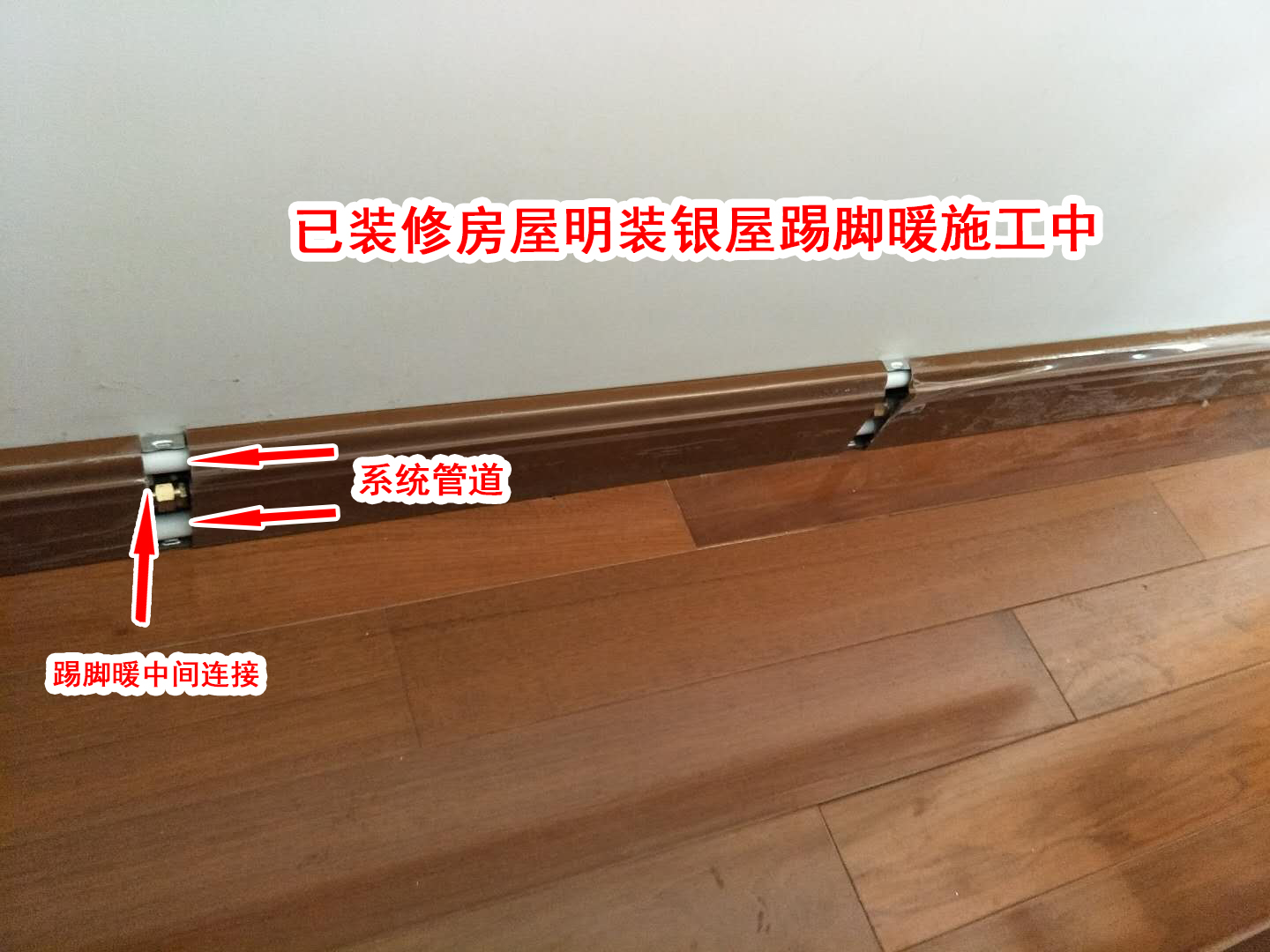 作为踢脚暖的发明者银屋暖通暖通国际生产的银屋®踢脚暖还具有以下显著特点,这就是银屋踢脚暖的设计厚度是30mm,后面翅片上下的空间正好分别可以放得下一根外径20mm6分)的铝塑管,这样,在已装修好房屋安装踢脚暖时,只要把原来的踢脚线拆除换成银屋踢脚暖,供暖的系统管道可以沿着踢脚暖后面布置,被踢脚暖的面板遮盖了起来,墙面上再也看不到这些难看的供暖管道,采用双管并联同程式采暖系统,供暖主管沿着整套房子的外墙内侧布置,过墙打孔,不用过室内门,因此门上也看不到绕过的管道,再配上专门设计的踢脚暖明装温控阀门,每个房间一个回路,可以做到分室控温,即达到尽量多的节能,同时也提高舒适度。