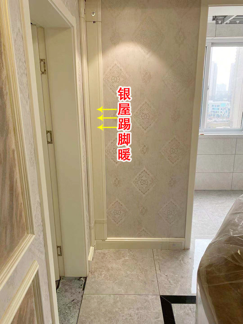 由于每米的散热量高,围绕房间一圈安装,热负荷配置高,供暖时的水温就可以低,一般50-60度的供暖水温,室温就可以达到20度左右。而且银屋踢脚暖的设计的厚度正好可以满足后面布置2根外径20mm的供暖管道,在已装修房屋安装时,只要把原来的踢脚线拆除,换上这种踢脚暖,供暖系统管道可以从其后面布置,过墙打孔,墙面上看不见管道,也不会破坏原来的装修装饰。
