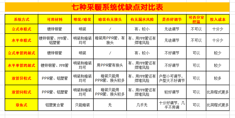 (图十一、七种采暖系统优缺点对比表)