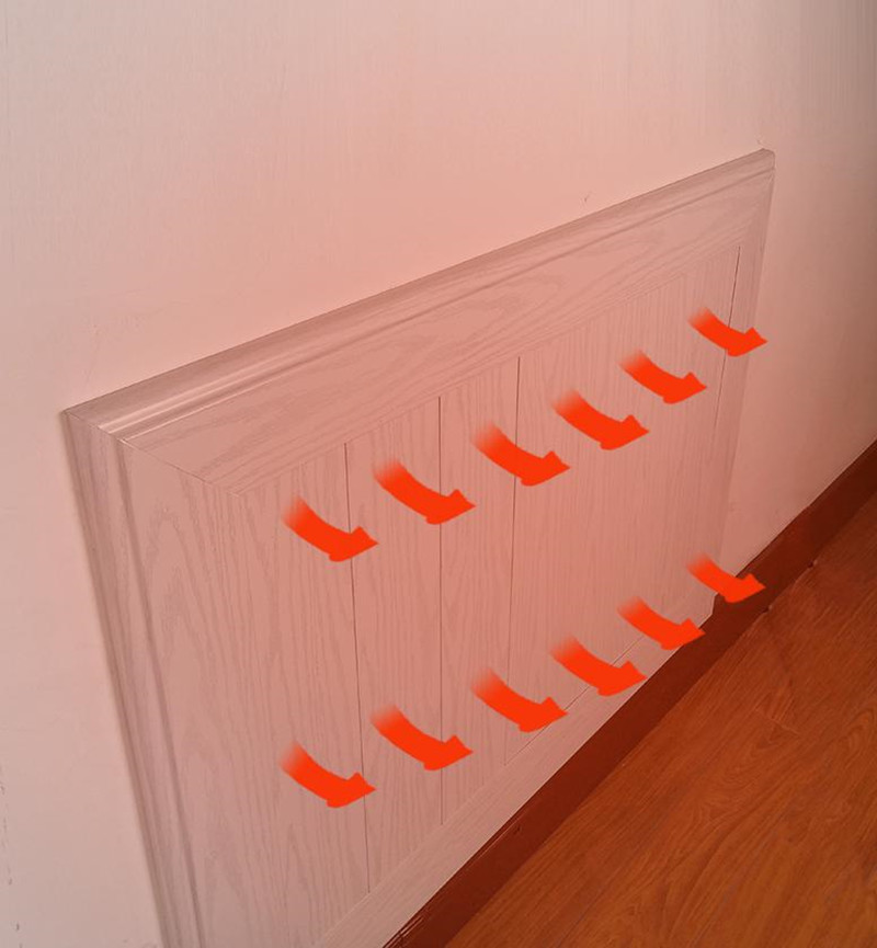 从上面超薄墙围式散热器的结构和安装方法可以看出,散热器与墙面之间没有对流缝隙,散热器上下装饰盖上没有预留对流孔,散热器内腔以及与墙面之间都形成不了对流。因此,墙围式散热器主要靠向前热辐射加热,很少有向上对流,不会形成烟囱效应,不会在散热器墙面上吸附灰尘,不会使墙面发黑